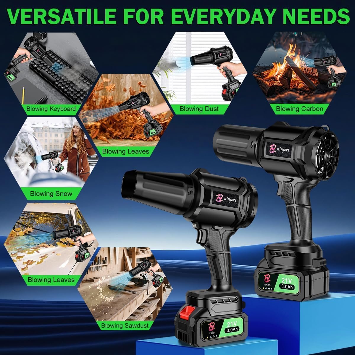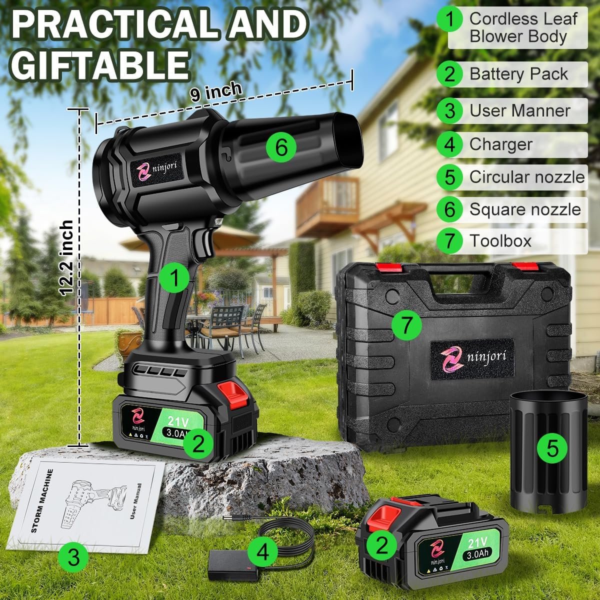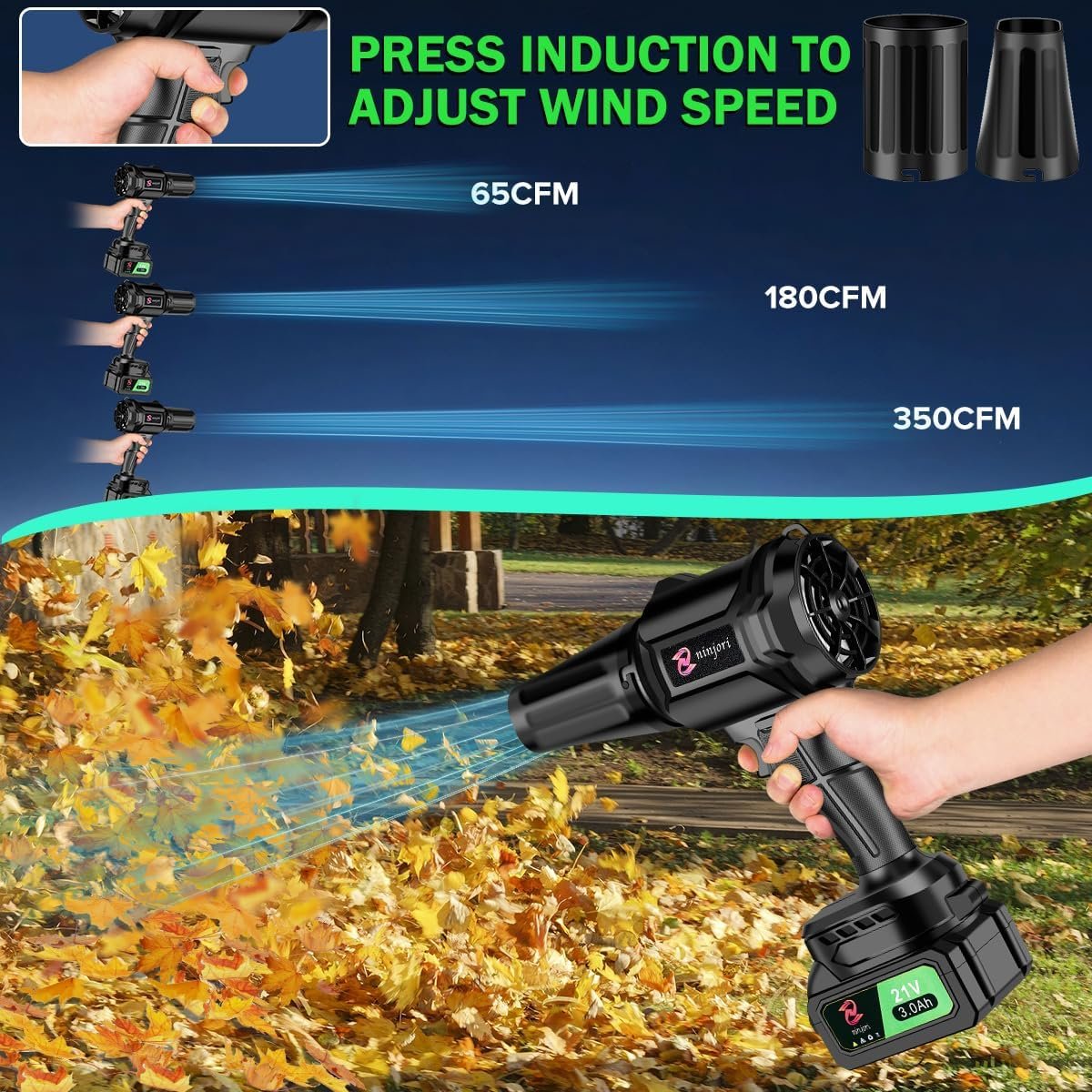 Battery Powered: The cordless leaf blower comes with two 21V-3000mAh lithium batteries and a charger. With these batteries, you don’t need to worry about running out of power when used outdoors. Temperature control protection ensures long-lasting use and avoids overheating during extended work.
